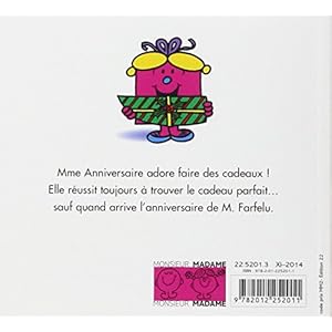 -Mme Anniversaire. Roger Hargreaves - Decitre ....Mme anniversaire adore faire des cadeaux ! Elle réussit toujours à trouver le cadeau sauf quand arrive l'anniversaire de M. Farfelu.